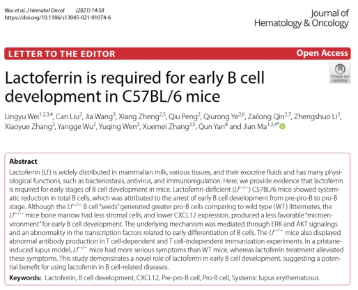 Dr. Jian Ma’s group reveals that lactoferrin is required for early B cell development in mice