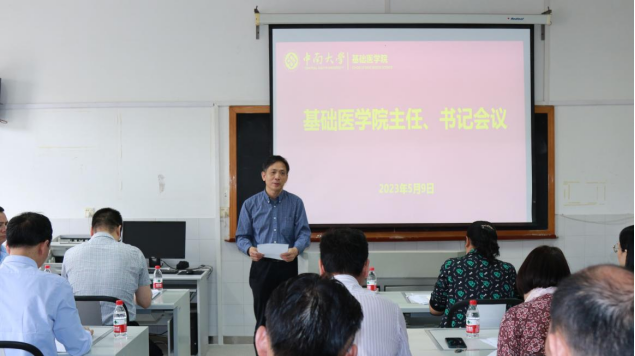2023年5月9日中午,基礎(chǔ)醫(yī)學(xué)院在孝騫樓352教室召開2023年系主任和支部書記會議,全體院領(lǐng)導(dǎo)、各系室所主任、各支部書記和院辦相關(guān)工作人員參加會議。會議由院黨委書記李順長主持。