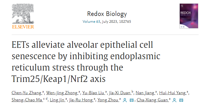 2023年6月2日,中南大學(xué)基礎(chǔ)醫(yī)學(xué)院管茶香教授團(tuán)隊(duì)在國際權(quán)威學(xué)術(shù)期刊《氧化還原生物學(xué)》(Redox biology,中科院一區(qū)TOP期刊)發(fā)表了題為“EETs alleviate alveolar epithelial cell senescence by inhibiting endoplasmic reticulum stress through the Trim25/Keap1/Nrf2 axis(EETs通過Trim25/Keap1/Nrf2軸抑制內(nèi)質(zhì)網(wǎng)應(yīng)激減緩肺泡上皮細(xì)胞衰老)”的研究論文。中南大學(xué)基礎(chǔ)醫(yī)學(xué)院生理學(xué)系為第一及通訊作者單位,基礎(chǔ)醫(yī)學(xué)院管茶香教授和周勇副教授為本文的共同通訊作者,2020級(jí)博士生張晨宇為第一作者。