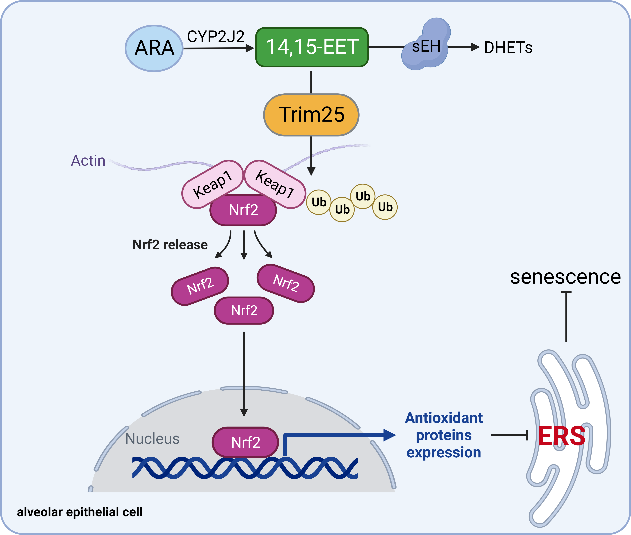肺泡上皮細(xì)胞(AECs)是維持肺功能穩(wěn)定的重要細(xì)胞,也是肺衰老的主要靶細(xì)胞。AECs衰老已被認(rèn)為是多種慢性肺部疾病的關(guān)鍵驅(qū)動(dòng)因素。因此,探討如何延緩AECs衰老對(duì)防治慢性肺部疾病極為重要。管茶香教授團(tuán)隊(duì)對(duì)花生四烯酸代謝在肺部疾病發(fā)生發(fā)展中的作用進(jìn)行了系列研究,前期已發(fā)現(xiàn)花生四烯酸經(jīng)CYP450通路生成的代謝產(chǎn)物環(huán)氧二十碳三烯酸(EETs)具有抗肺纖維化作用。該研究探討了EETs在抗AECs衰老中的作用,發(fā)現(xiàn)EETs可通過Trim25增強(qiáng)Keap1泛素化降解,促進(jìn)Nrf2入核發(fā)揮抗氧化作用,進(jìn)而抑制內(nèi)質(zhì)網(wǎng)應(yīng)激,減輕AECs衰老。該研究創(chuàng)新性提出EETs可能作為一種新型內(nèi)源性抗衰老物質(zhì),為防治年齡相關(guān)慢性肺部疾病提供了新思路。該研究是國家自然科學(xué)基金衰老領(lǐng)域重大研究計(jì)劃培育項(xiàng)目的重要成果之一。