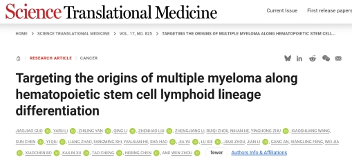 11月19日,中南大學(xué)腫瘤研究所周文課題組在國際知名學(xué)術(shù)期刊《科學(xué)轉(zhuǎn)化醫(yī)學(xué)》(Science Translational Medicine) 雜志在線發(fā)表最新成果“在造血干細(xì)胞淋巴系分化體系中揭示和靶向多發(fā)性骨髓瘤起始細(xì)胞”(Targeting the origins of multiple myeloma along hematopoietic stem cell lymphoid lineage differentiation)研究論文。該研究由中南大學(xué)腫瘤研究所周文教授、軍事醫(yī)學(xué)科學(xué)院陳河兵教授、中國醫(yī)學(xué)科學(xué)院血液與健康全國重點(diǎn)實(shí)驗(yàn)室程濤教授課題組合作完成。