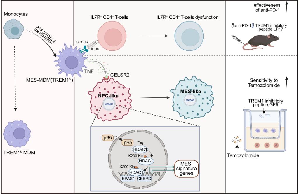 膠質(zhì)母細胞瘤(glioblastoma, GBM)是成人最常見的顱內(nèi)惡性腫瘤。盡管患者接受了最大范圍的手術(shù)切除,并輔以替莫唑胺(Temozolomide,TMZ)、放療、免疫或電場治療等綜合措施,但患者的復(fù)發(fā)率和耐藥性仍然很高。目前,制約GBM預(yù)后的生物學(xué)因素主要包括腫瘤的高侵襲性、腫瘤細胞和免疫抑制微環(huán)境的異質(zhì)性等。因此,深入解析GBM細胞與免疫微環(huán)境的異質(zhì)性及相互作用規(guī)律,對闡明GBM惡性進展的機制及探尋克服TMZ耐藥的治療靶點至關(guān)重要。本研究首次鑒定出了高表達TREM1的新型MES-MDM亞群,該亞群可通過非經(jīng)典的TNF-CELSR2配受體對介導(dǎo)腫瘤細胞HDAC1的K200位點發(fā)生乳酸化修飾,促進腫瘤細胞向MES-GBM細胞惡性轉(zhuǎn)化。TREM1抑制肽靶向MES-MDM可增加GBM對TMZ的敏感性。本研究揭示了MDM新亞群導(dǎo)致GBM惡性進展的新機制,并為增加TMZ治療敏感性提供了新靶點。