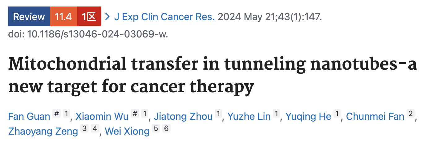 近日,由中南大學(xué)基礎(chǔ)醫(yī)學(xué)院首屆基礎(chǔ)醫(yī)學(xué)拔尖班(2021級(jí))關(guān)凡同學(xué)與吳曉敏等合作在《J Exp Clin Cancer Res》雜志發(fā)表了一篇題為“Mitochondrial transfer in tunneling nanotubes-a new target for cancer therapy”的綜述。中南大學(xué)基礎(chǔ)醫(yī)學(xué)院熊煒研究員、曾朝陽研究員和范春梅副教授為本文的指導(dǎo)老師。