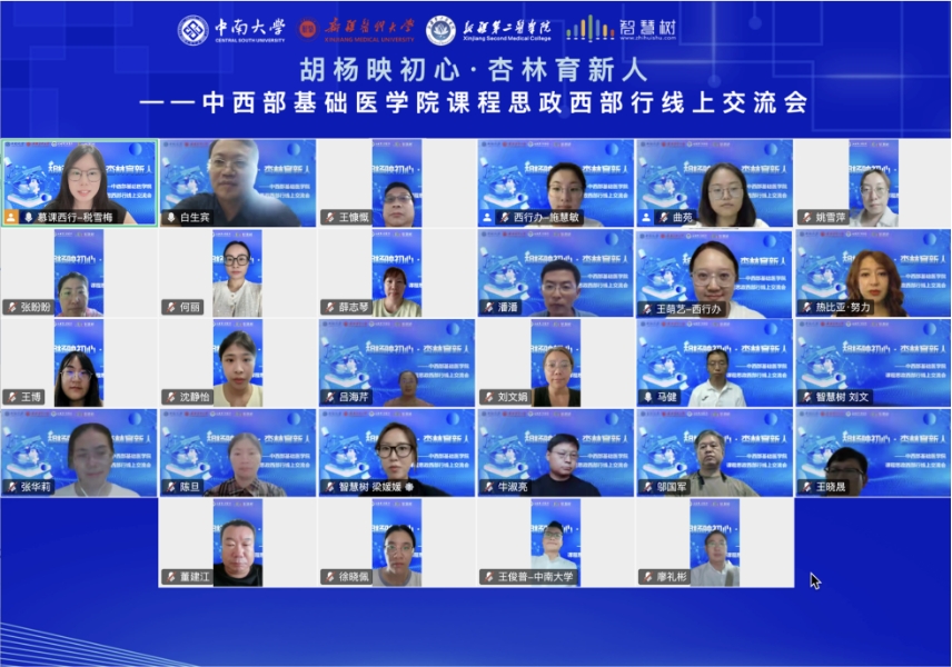 2025年8月20日下午,“胡楊映初心·杏林育新人——中西部基礎(chǔ)醫(yī)學(xué)院課程思政西部行交流會”通過線上平臺順利舉行。本次會議由中南大學(xué)湘雅基礎(chǔ)醫(yī)學(xué)院主辦,新疆醫(yī)科大學(xué)、新疆第二醫(yī)學(xué)院、智慧樹網(wǎng)協(xié)辦,旨在深入探討基礎(chǔ)醫(yī)學(xué)課程思政建設(shè)的路徑與方法,推動中西部醫(yī)學(xué)院校思政育人資源共享與協(xié)同發(fā)展。來自中南大學(xué)、新疆醫(yī)科大學(xué)、新疆第二醫(yī)學(xué)院、海南醫(yī)科大學(xué)、錦州醫(yī)科大學(xué)、湘南學(xué)院等高校共300余名教師參會。