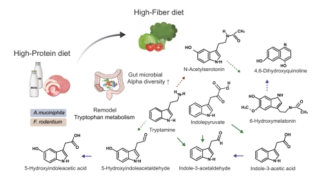 飲食與腸道微生物之間的相互作用是研究微生物和機(jī)體健康關(guān)系中的重要內(nèi)容。盡管以往的研究發(fā)現(xiàn)不同飲食干預(yù)對腸道微生物組成和代謝物譜的影響,但對于飲食轉(zhuǎn)變過程中腸道微生物群結(jié)構(gòu)、功能潛能以及飲食變化下的微生物影響的代謝通路的具體變化仍不明確。本研究基于多組學(xué)整合分析,系統(tǒng)揭示了高蛋白飲食到高纖維飲食轉(zhuǎn)變下腸道微生物群落結(jié)構(gòu)和代謝通路的動(dòng)態(tài)相應(yīng)機(jī)制。結(jié)果顯示,高蛋白飲食可顯著降低菌群多樣性并擾亂代謝穩(wěn)態(tài),而高纖維飲食可有效恢復(fù)微生態(tài)平衡,促進(jìn)與健康相關(guān)的色氨酸及糖代謝通路活化。研究還發(fā)現(xiàn),Akkermansia muciniphila 與 Faecalibaculum rodentium 為這一過程中的關(guān)鍵響應(yīng)菌種,在飲食調(diào)節(jié)與代謝重塑中發(fā)揮重要作用。該成果為闡明“飲食—微生物—代謝”相互作用機(jī)制提供了新思路,對個(gè)體化營養(yǎng)干預(yù)與代謝性疾病防控具有重要科學(xué)意義。