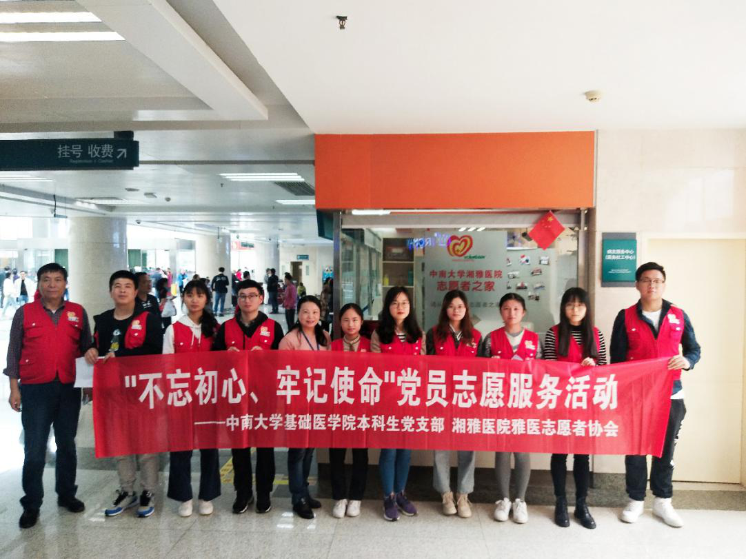 2019年10月24日、25日,基礎(chǔ)醫(yī)學(xué)院本科生黨支部聯(lián)合湘雅醫(yī)院雅醫(yī)志愿者協(xié)會(huì),在中南大學(xué)湘雅醫(yī)院開(kāi)展了“不忘初心、牢記使命”黨員志愿服務(wù)活動(dòng),支部共有18名黨員分兩批次參加了此次活動(dòng)。