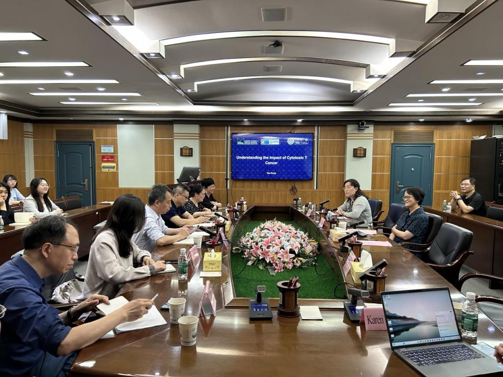 5月28日,牛津大學(xué)Ita Askonas 轉(zhuǎn)化免疫學(xué)終身講席教授、中國醫(yī)學(xué)科學(xué)院牛津研究所英方所長董濤一行來院進(jìn)行學(xué)術(shù)交流,雙方在杏林校區(qū)孝騫樓八樓二會(huì)議室開展座談會(huì),院黨委書記王慷慨,院長熊煒,副院長劉俊文,研究員周文、馬健、譚斯品等教授及部分學(xué)生參加交流。會(huì)議由熊煒院長主持。